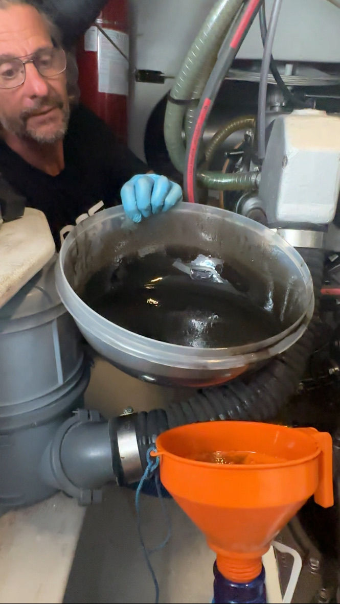 Zum Glück hatten wir noch genügend neues Öl an Bord, und in der vergessenen Kiste fand sich auch ein neuer Ölfilter. Es fehlte nur noch ein passender Behälter für das alte Öl. Wobei „altes Öl“ zu diesem Zeitpunkt bereits ein erstaunlich dehnbarer Begriff war.
